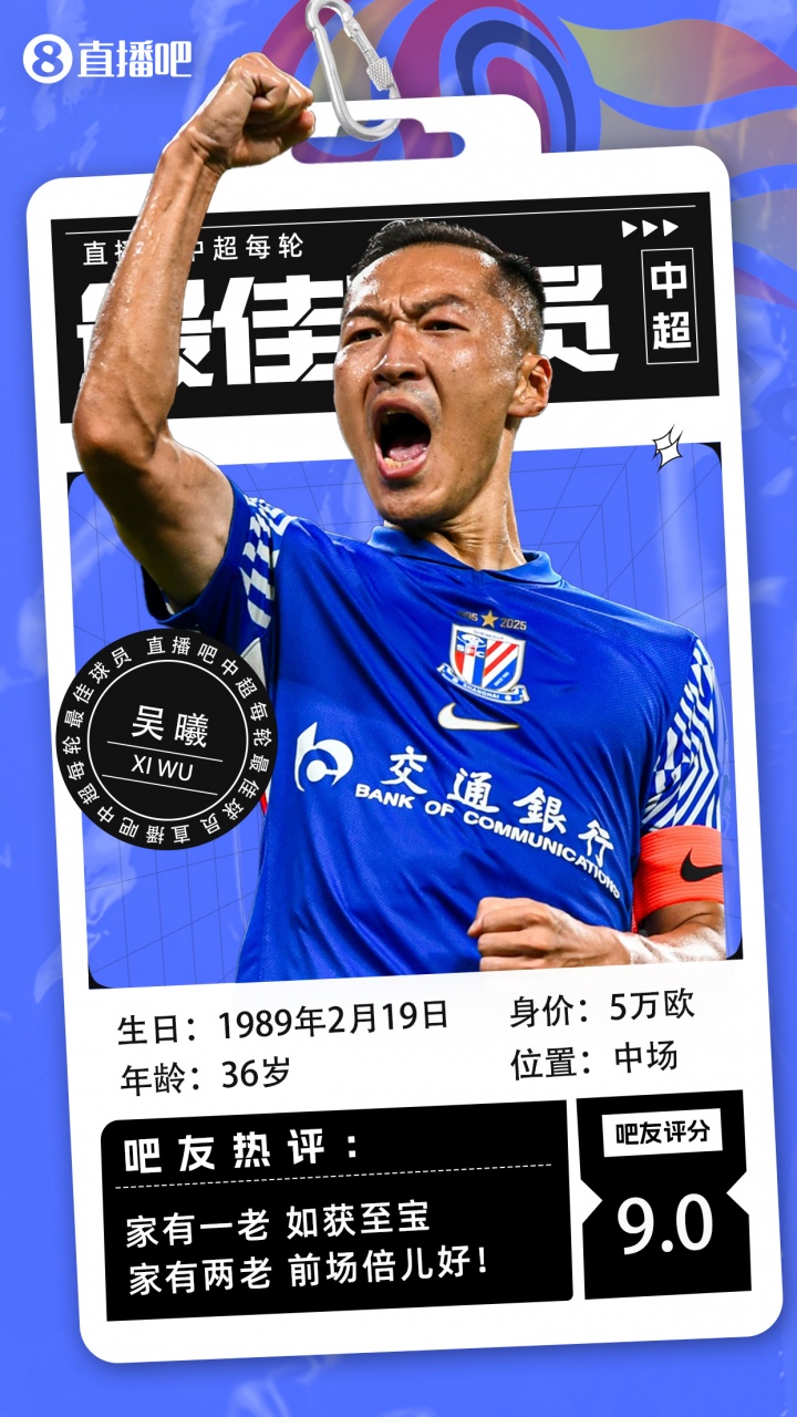【直播吧】中超第26轮最佳球员:申花队长吴曦!36岁依旧中流砥柱
